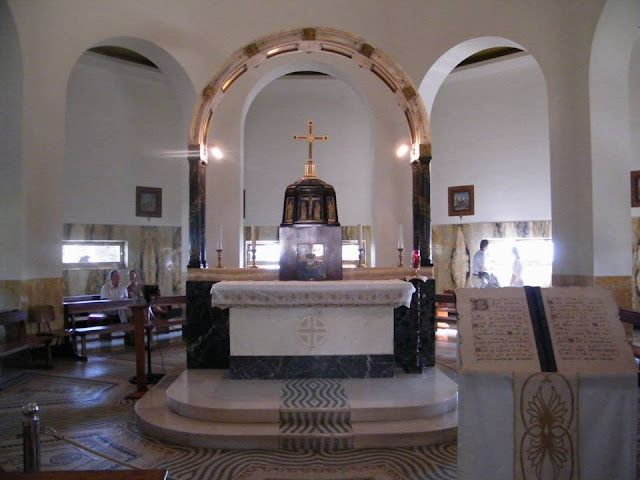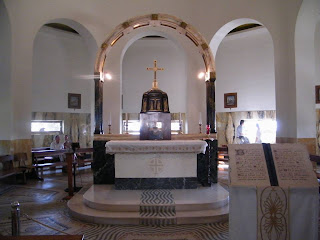 Ebéd után meglátogattuk a templomot is, amely 1936-38 között épült. A híres olasz építész, Antonio Barluzzi tervezte. A templom belsejében, az oltár körüljárható. Nagyon praktikus, hogy körülötte bárhol le lehet ülni, és csendben imádkozni, elmélkedni. Miközben ott üldögéltem egy zarándok csoport érkezett, de nagyon diszkréten beszélgettek, így nem zavart. A szentély fölötti nyolcszögletű kupola falain a nyolc boldogság olvasható latin nyelven. (Mt 5, 1-12 Lk 6, 12-16)